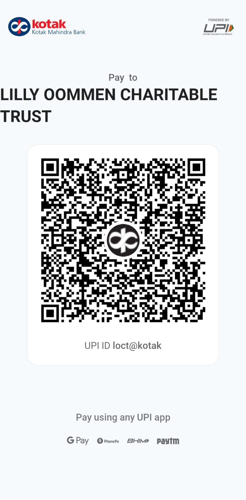 Cheque or Demand Draft can be drawn in favour of "Lilly Oommen Charitable Trust". These can be sent alongwith the Donation letter to the Trust’s office address:
